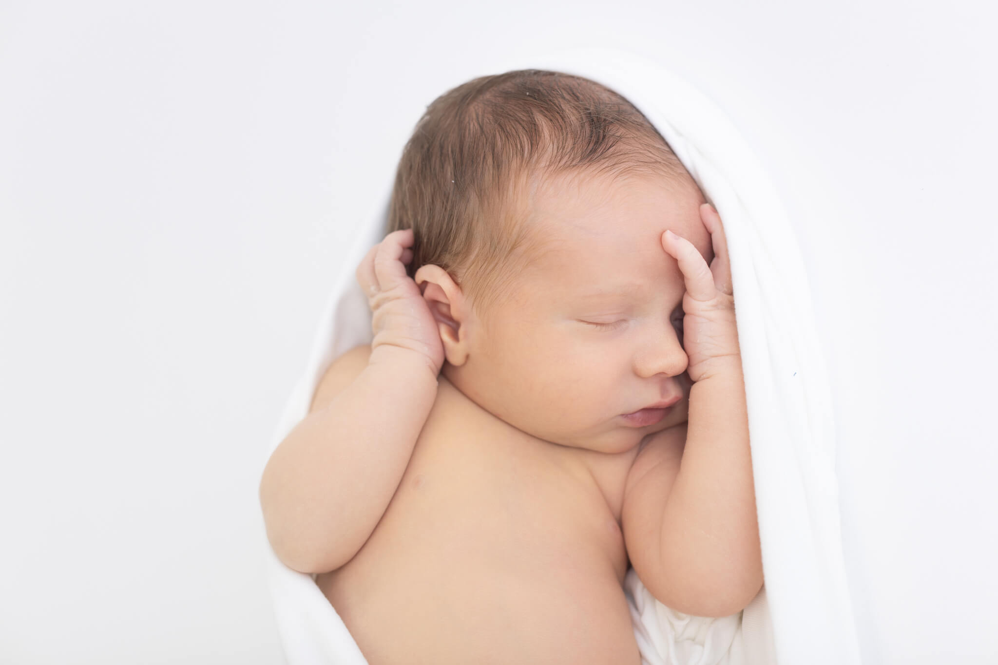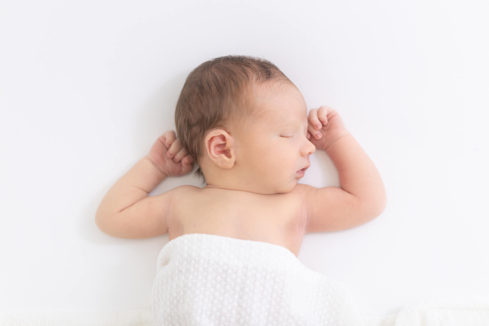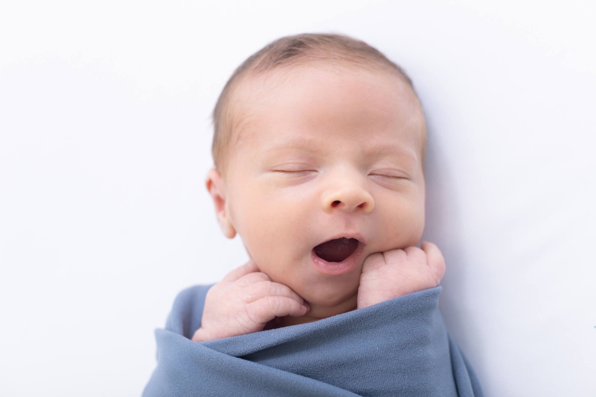 No worries! While sleepy babies are easier to pose, we can capture beautiful awake shots too. Some of the most treasured images are those alert newborn eyes looking right at the camera.